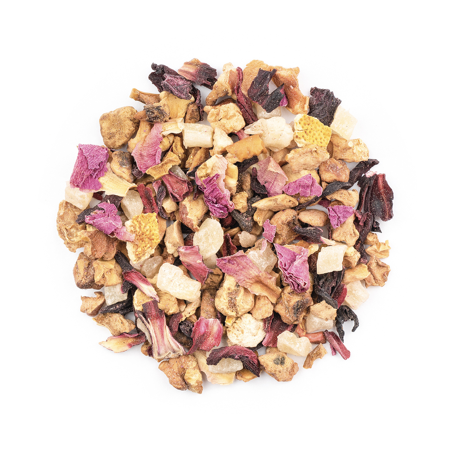 Apfelstücke, Ananaswürfel (Ananas, Zucker), Hibiskusblüten, Orangenschalen, Rote Bete, Aroma, Zitronenschalen, Granatapfelkerne, Bauernrosenblüten.