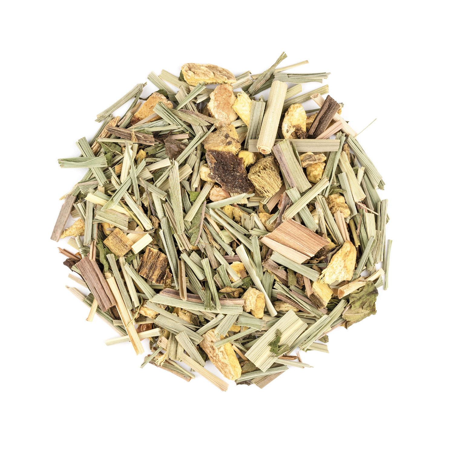 Zitronengras, Süßholzwurzeln, Ingwerstücke (25%), Pfefferminze, Zitronenschalen, schwarze Pfefferkörner.